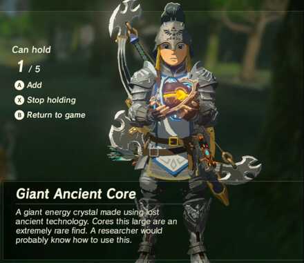 A crafting item used to make or upgrade Ancient weapons and shield. Giant ancient cores are one of the hardest items to obtain in Breath of the Wild but also pretty essential for acquiring and upgrading important weapons and armourThis post explains one reasonably fool-proof and safe way to farm them. Methods of Farming Giant Ancient Cores The fastest way to find Giant Ancient Cores is to seek out Guardian Stalkers and get them as drops.
